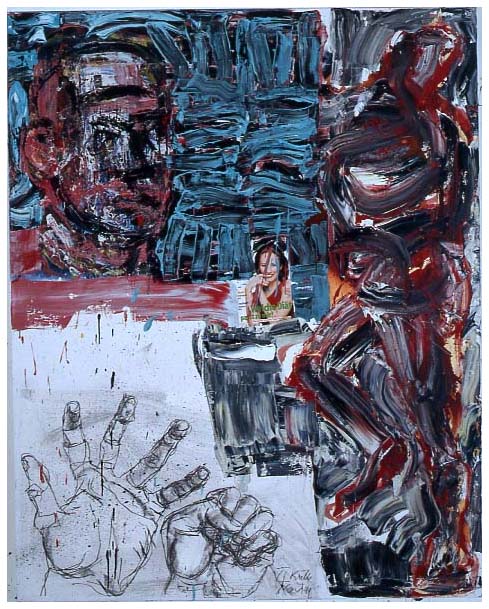 "Handzeichen 4" (1999/2002, Öl auf Leinwand/Collage, 200 x 160 cm)
