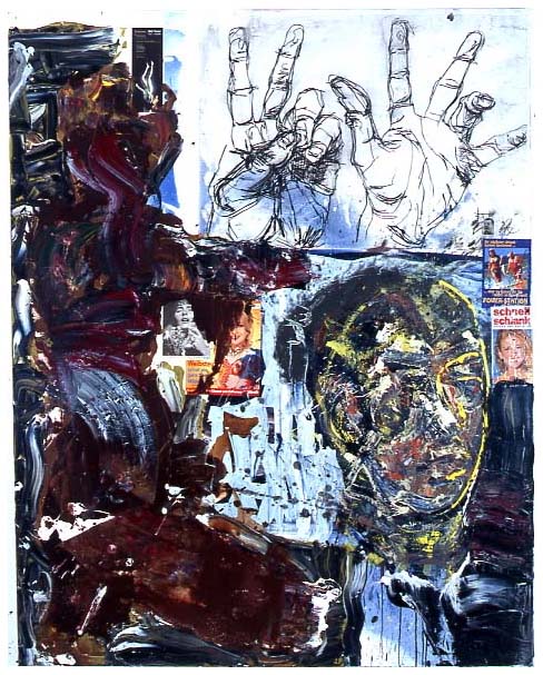 "Handzeichen 9" (1999/2002, Öl auf Leinwand/Collage, 200 x 160 cm)