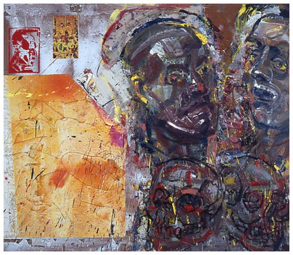 "Schädel und Janusköpfe 2" (2000, Öl, Collage auf Hartfaser, 163 x 200 cm)
