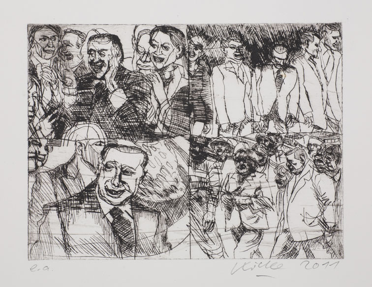 "Erdbeben in Italien, Merkel und Berlusconi" (2011, Kaltnadelradierung, 19x25,5 cm)