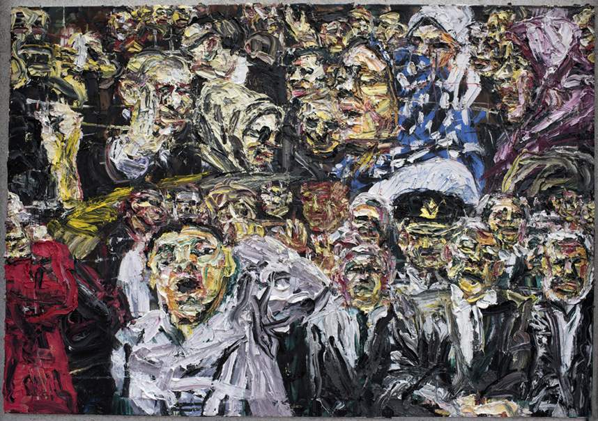 "Soma Türkei Bergwerksunglück II Ministerpräsident Gül, Staatspräsident Erdogan und Frau" (2014, Öl auf Baumwolle, 140 x 200 cm)