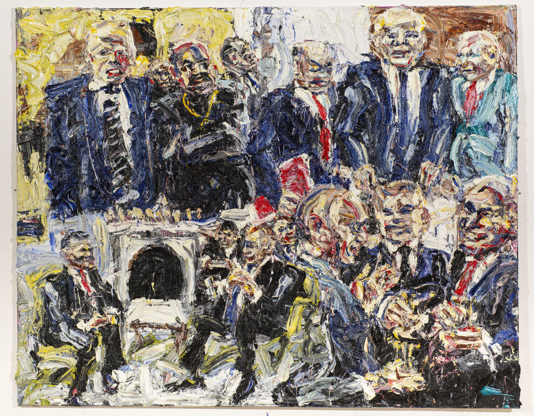"Am Kamin - Donald Trump und Rapper, Vladimir Putin und Rex Tillerson, Vice President Pence" (2017, Öl auf Baumwolle, 160 x 200 cm)