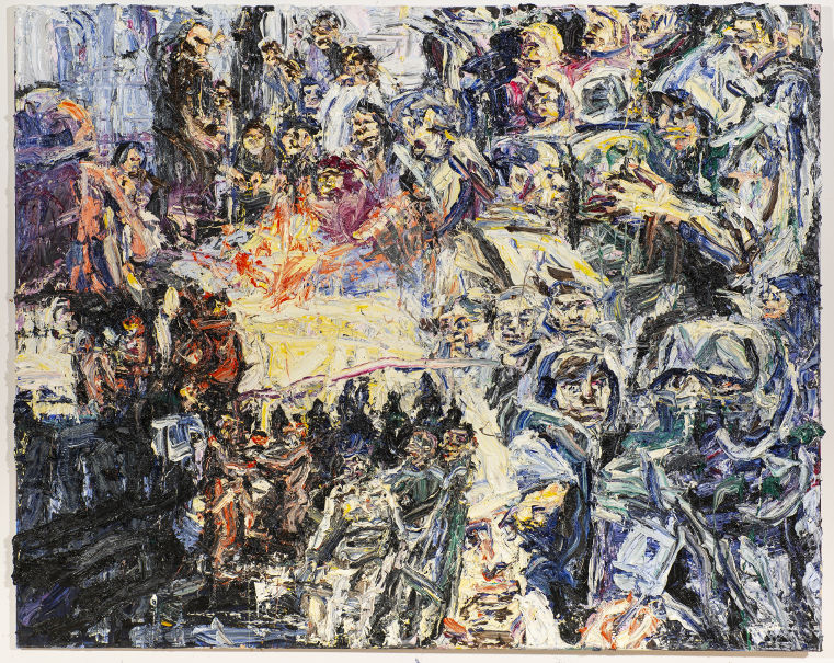 "Am Feuer 2 - Evakuierung von Bombenopfern " (2017, Öl auf Baumwolle, 160 x 200 cm)
